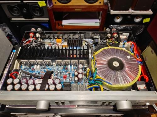 達到11OW/8歐輸出的100A裝載了更強大的電源系統。使用的是一枚巨型的360瓦環形變壓器,有獨立繞制的線圈,分別供給各自電壓和電流值都不同的回路。這款設計使得100A功率與重量的比例恰到好處,而磁場的幹擾也是最大限度地隔絕在外。此舉可以使濾波的效果更加理想,同時也使得100A能以較為小巧的體積發出強而有力還不失準繩的聲音。